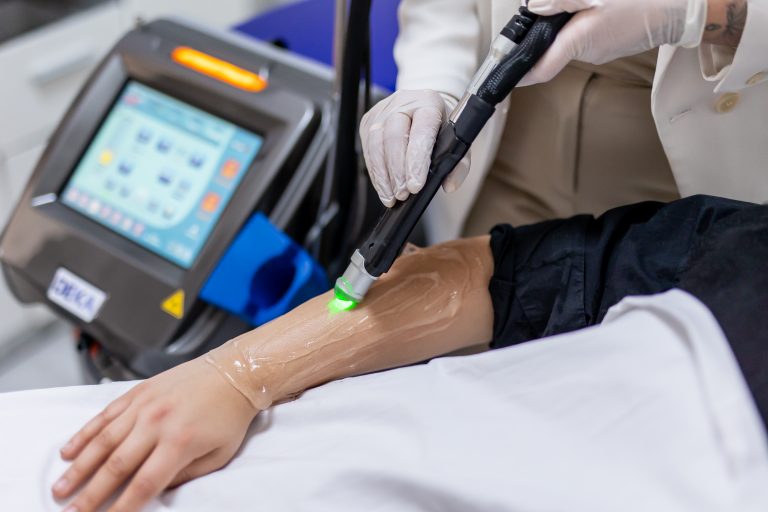 Nachdem sowohl du als auch wir die Schutzbrille aufgesetzt haben, beginnen wir mit der Behandlung. Hier trifft ein toller Laserstrahl auf die entsprechende Körperpartie und lässt die Magie für sich arbeiten. Keine Sorge, die Behandlung ist schmerzfrei.